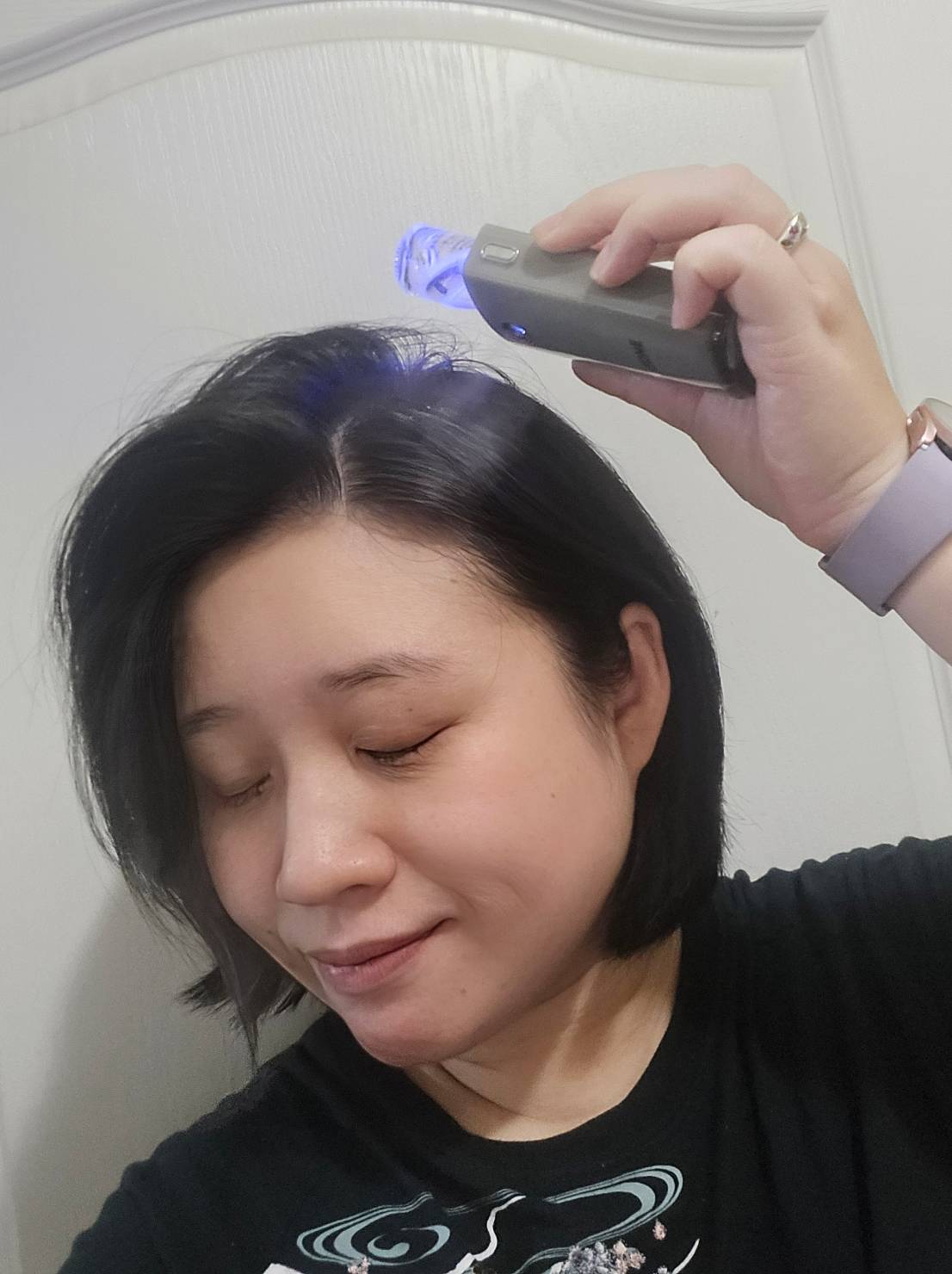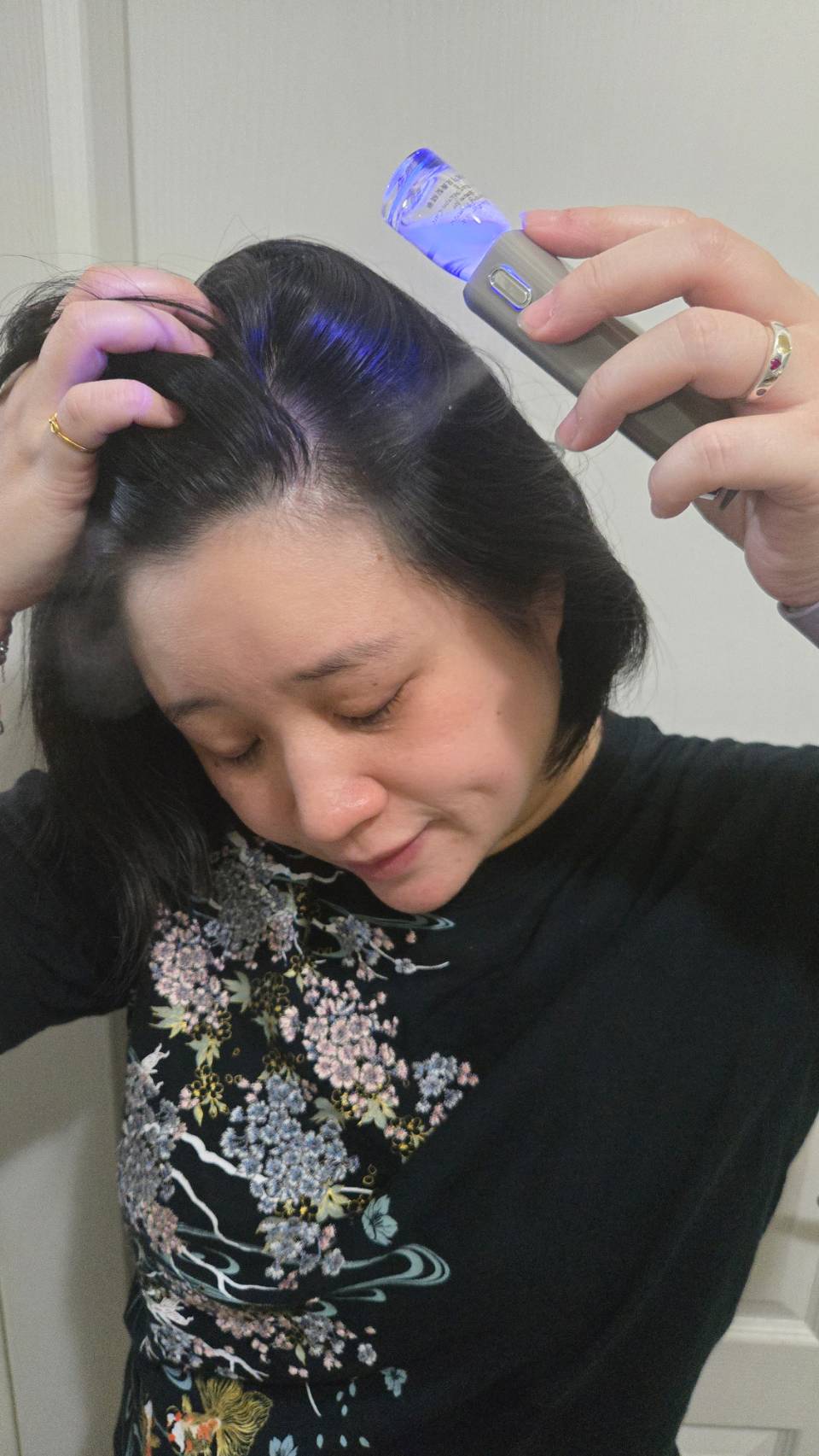 霧化中的分子以超微粒子噴出,使用中我會輕輕按摩頭皮撥弄髮根幫助安瓶的精華能更深層被頭皮吸收
