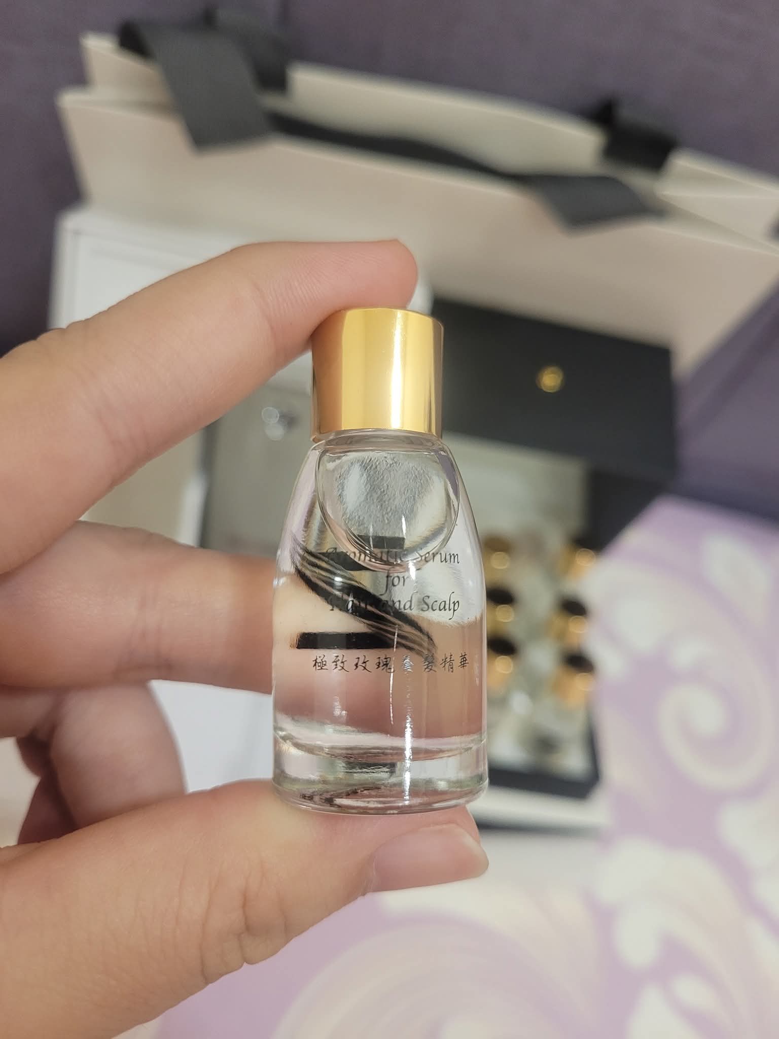 超級幸運抽中試用大隊,收到的試用品好精緻,玫瑰養髮精華安瓶共有9瓶,打開就有淡淡的玫瑰香氣,且每瓶底座都有設計獨立的暗坐防撞材質,不用怕運送途中被撞破,還有附霧化導入儀機器,內含充電線及防塵袋。