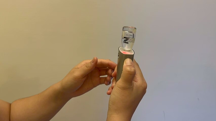 小小一台DEZONE霧化導入儀一手就能掌握,而且使用上非常方便,充飽電後,將養髮精華安瓶(藍桉月見)裝入儀器中,再按下開啟鍵,就能在洗頭後,髮根吹乾的情況下使用,導入微米級滋養精華霧滴,深入髮根,讓髮根能自然迅速吸收精華。