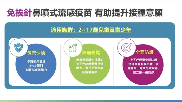 鼻噴式流感疫苗不需針劑注射,可望提高兒童及青少年接種意願建立第一道防線,進而降低長者因流感就醫的風險
