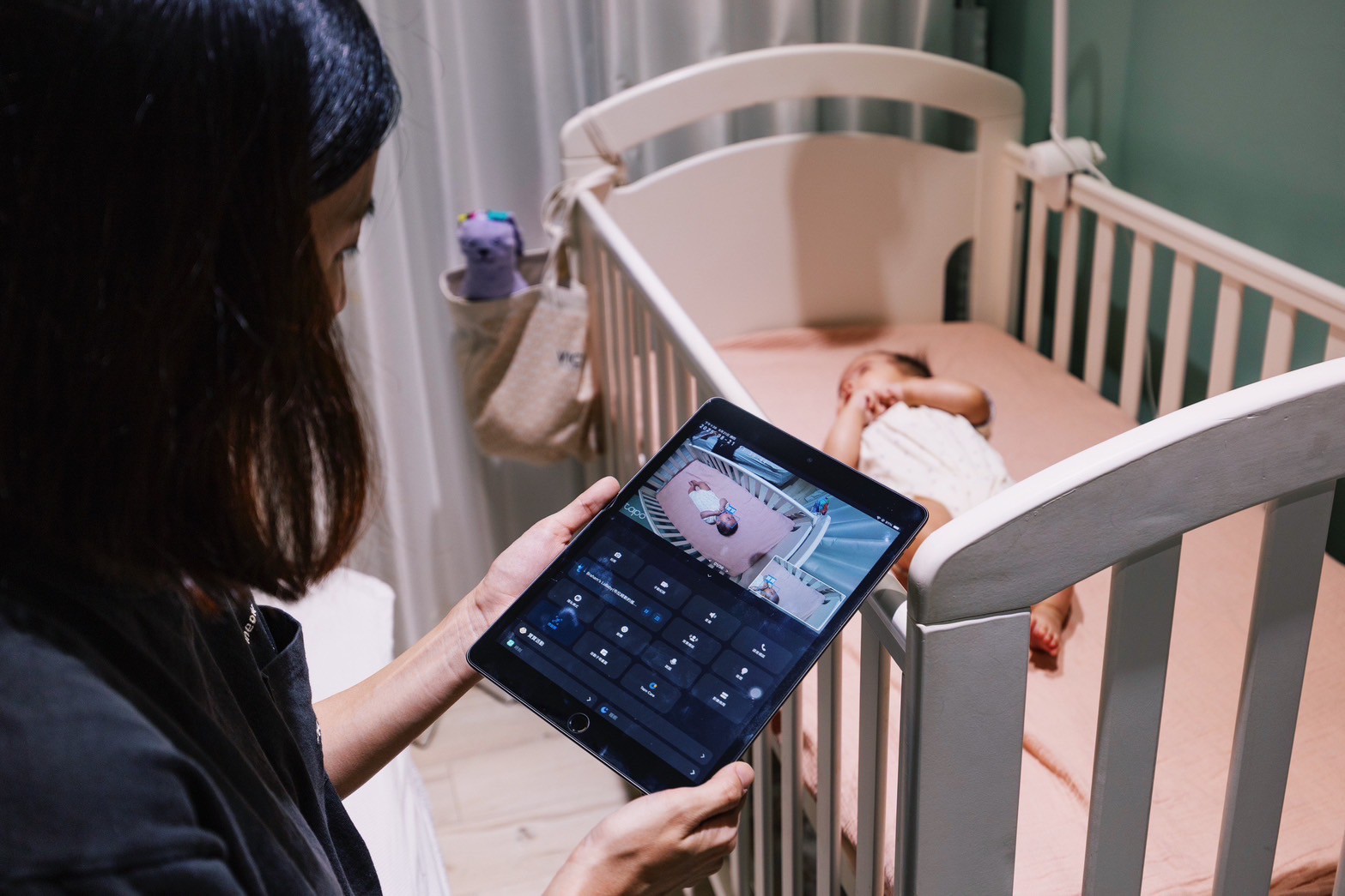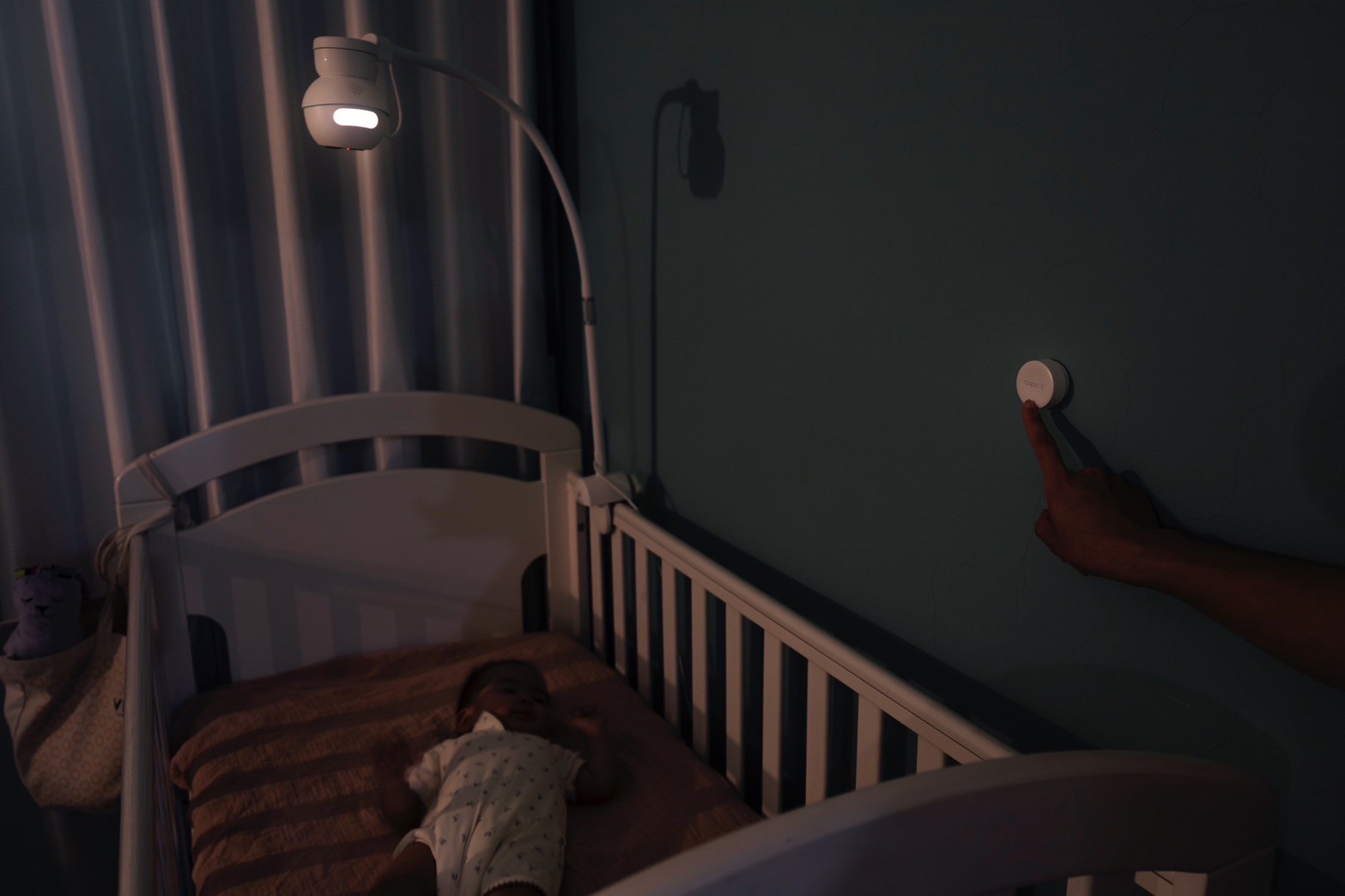 我實際把延伸支架固定在嬰兒床上後,發現安裝效果非常牢固,完全不會晃動或鬆脫。搭配隨盒附贈的智慧按鈕與夜燈功能,立刻就變成了一個可以遠端控制的智慧小夜燈。就算我常常在廚房處理寶寶的副食品,也能透過按鈕,根據寶寶的狀態遠端調整燈光亮度。像是寶寶熟睡的時候,我就會遠端把燈用機調暗,夜裡若要換尿布時,再打開小夜燈功能,不打擾寶寶的情況下,也讓我和老公在黑暗中進出房間更安心。