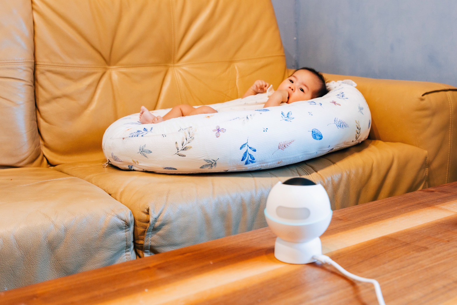 ▲寶寶自己在沙發上準備午睡,有了TP-Link全新推出的寶寶攝影機Tapo C840輕鬆放在桌上,不用跑來跑去就能和老公就能夠過手機安心看著寶寶。