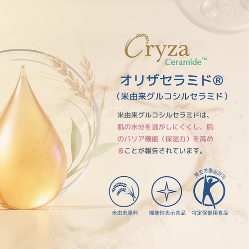 Q潤桃姬之所以能成為肌底保養的資優生,關鍵就在於它選用了來自日本的專利成分「ORYZA CERAMIDE®」。它是從天然玄米胚芽中萃取出的純植物性神經醯胺,也得到日本厚勞省食品功能性原料認可,FOSHU(Foods for Specified Health Uses)為日本官方制度,要求具備以下特性: