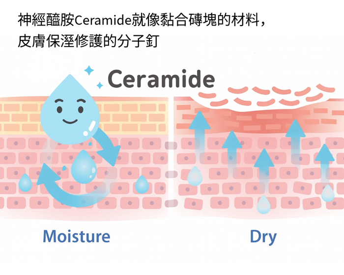 生活就像陀螺一樣轉個不停,當妳發現肌膚好像變得特別容易乾燥、粗糙,不容易上妝時,很可能是為肌膚鎖水的天然屏障正漸漸流失的警訊!這道屏障的關鍵就是「神經醯胺 (Ceramide)」,神經醯胺存在於肌膚最外層的角質層,並且占角質層脂質的一半以上。若將肌膚比喻成一面用水泥磚牆,神經醯胺就是水泥與磚之類的縫填料,有助將角質層細胞牢牢黏在一起,形成天然保護,發揮水泥牆的效果,防止外在環境的刺激,以及內在水分的散失。