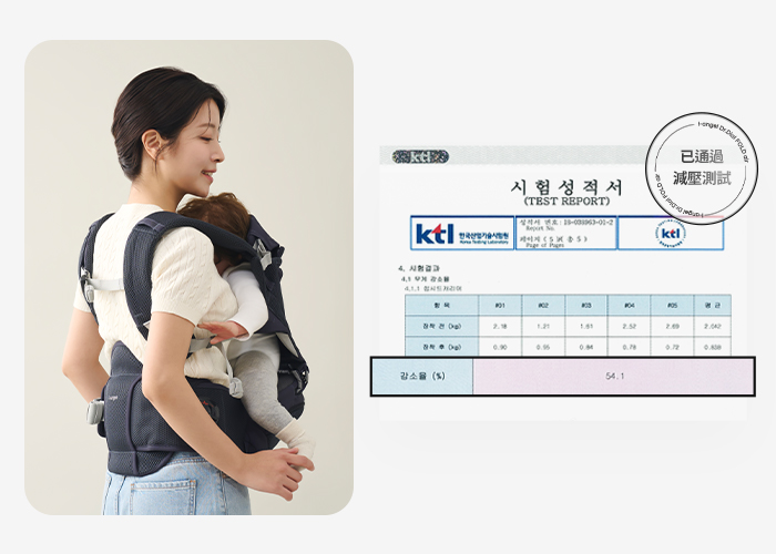 傳統背帶因重量集中在肩頸與下背,長時間揹負容易造成壓力累積,引發腰痠與姿勢不良。i-angel 獨家專利穩核腰靠能將重量平均分散至肩、腹、腰、背,讓揹負者的核心更加穩定,經韓國國家級檢測機構 KTL(Korea Testing Laboratory)實驗認證可減壓高達 54.1%,讓爸媽即使長時間揹寶寶,也能有效減輕負擔保持舒適與正確姿勢。