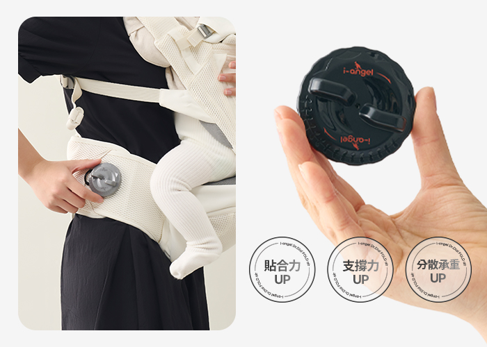獨家專利旋鈕設計,即使寶寶揹在身上,也能單手快速調整背帶密合度。不同於傳統背帶需要反覆拉扯調整,i-angel 只需單手一秒即可完成精準貼合,即使是媽媽爸爸交替使用,都能立即達到客製化的合身效果。旋鈕設計同時能消除腰帶與身體間的空隙,讓寶寶更緊密依偎懷抱,不僅提升穩定性,也有效降低晃動與鬆脫風險。