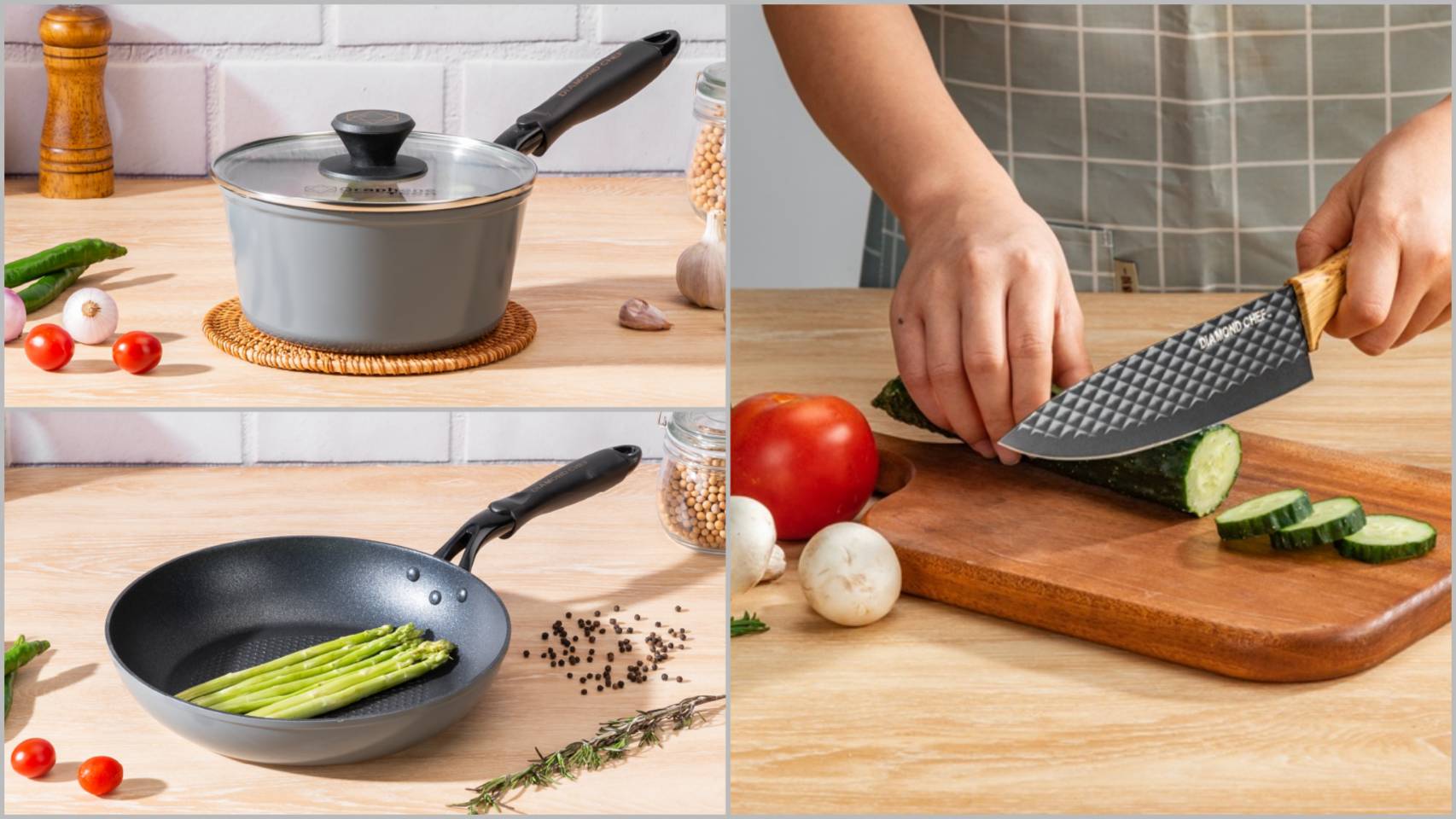 DiAMOND CHEF以「石墨烯黑金科技」聞名,其鍋具採用領先業界的物理不沾材質,導熱效果提升40%,強度高且耐刮磨,讓烹飪不僅是一種日常,更成為一場藝術的展演。品牌團隊遠赴比利時學習工藝技術,每一只鍋具皆通過 15萬次耐刮測試,兼具實用性與視覺美感。此次與海霸王的跨界合作,不只是產品結合,更是對「品質」、「工藝」與「生活美學」三者平衡的完美詮釋。