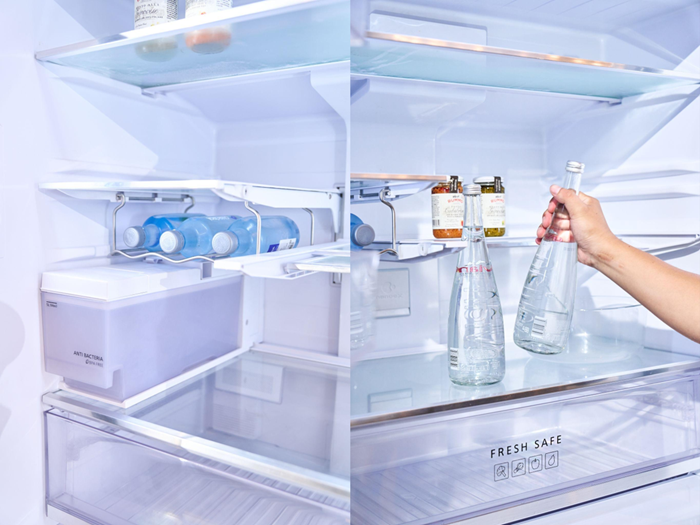 輕奢品味系列電冰箱內建自動製冰與多層次可調節收納層架,可依使用習慣隨時變換收納方式,享受冰涼暢快與極致新鮮