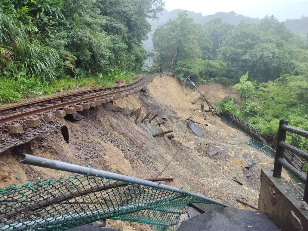 平溪區 嶺腳車站至瀑布段:邊坡全面崩塌、鐵軌路基被掏空,台灣鐵路管理局 (台鐵) 平溪線暫時停駛,改以公路接駁。