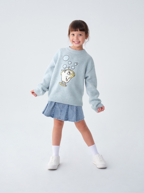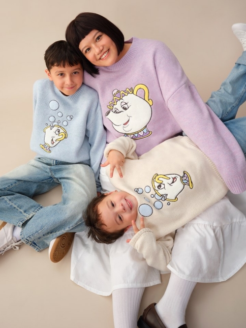 本次親子裝主打「一大一小」穿搭概念,成人系列更能夫妻共穿,小孩則能搭上可愛童裝版本。像是「賽巴斯丁 vs 小比目魚」、「茶壺太太 vs 阿奇」等角色對應設計,讓家庭穿搭多了故事性與童趣。全系列以柔和配色與刺繡細節呼應迪士尼角色,時髦又充滿溫度。