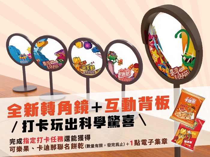 這次館內推出全新「轉角鏡」裝置,包括1款大轉角鏡與4款小轉角鏡,邀請爸媽和孩子們一起動手玩,從不同角度探索科學的趣味驚喜,現場完成打卡任務可獲得集章1點與限量餅乾(可樂果與卡迪那)。每個科學館還設置了專屬互動背板,可以貼趣味貼紙、拍照打卡。