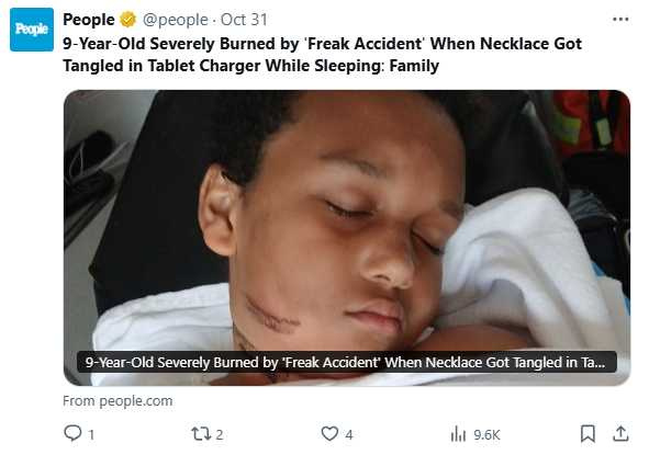 這場意外讓他被送進兒科重症監護室,家人心有餘悸。母親哽咽說到:「要不是奇蹟,我們可能已經失去了孩子。」這起事件也再度提醒家長,千萬不要讓孩子在床上或床邊為電子產品充電入睡。