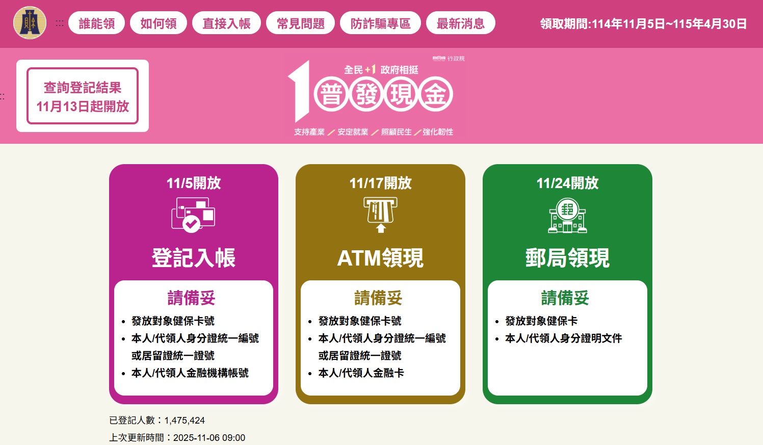 若你已在11月10日前完成登記入帳程序,根據財政部普發現金官網資訊,最快從11月11日晚上6點起,帳戶中就有機會出現這筆一萬元補助。這表示部分「幸運兒」可能比預期更早拿到現金。