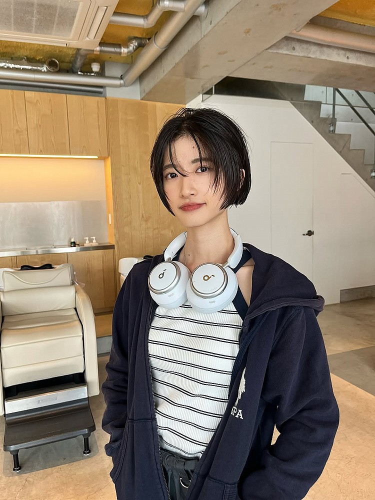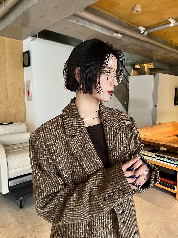 鬚鬚瀏海搭配齊短髮,是日韓短髮近年常見的人氣組合。瀏海以細緻髮束打造輕盈線條,在額頭形成自然「空氣感」,同時減輕髮型的分量。它同時擁有中分的率性與眉上瀏海的俏皮,無論搭配素顏或淡妝都很合適。