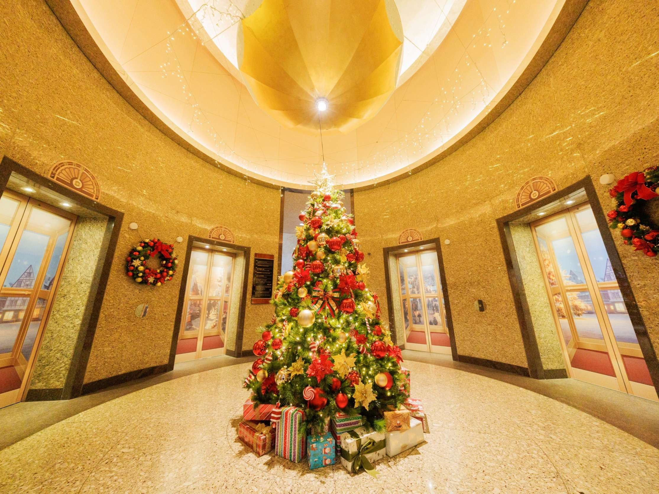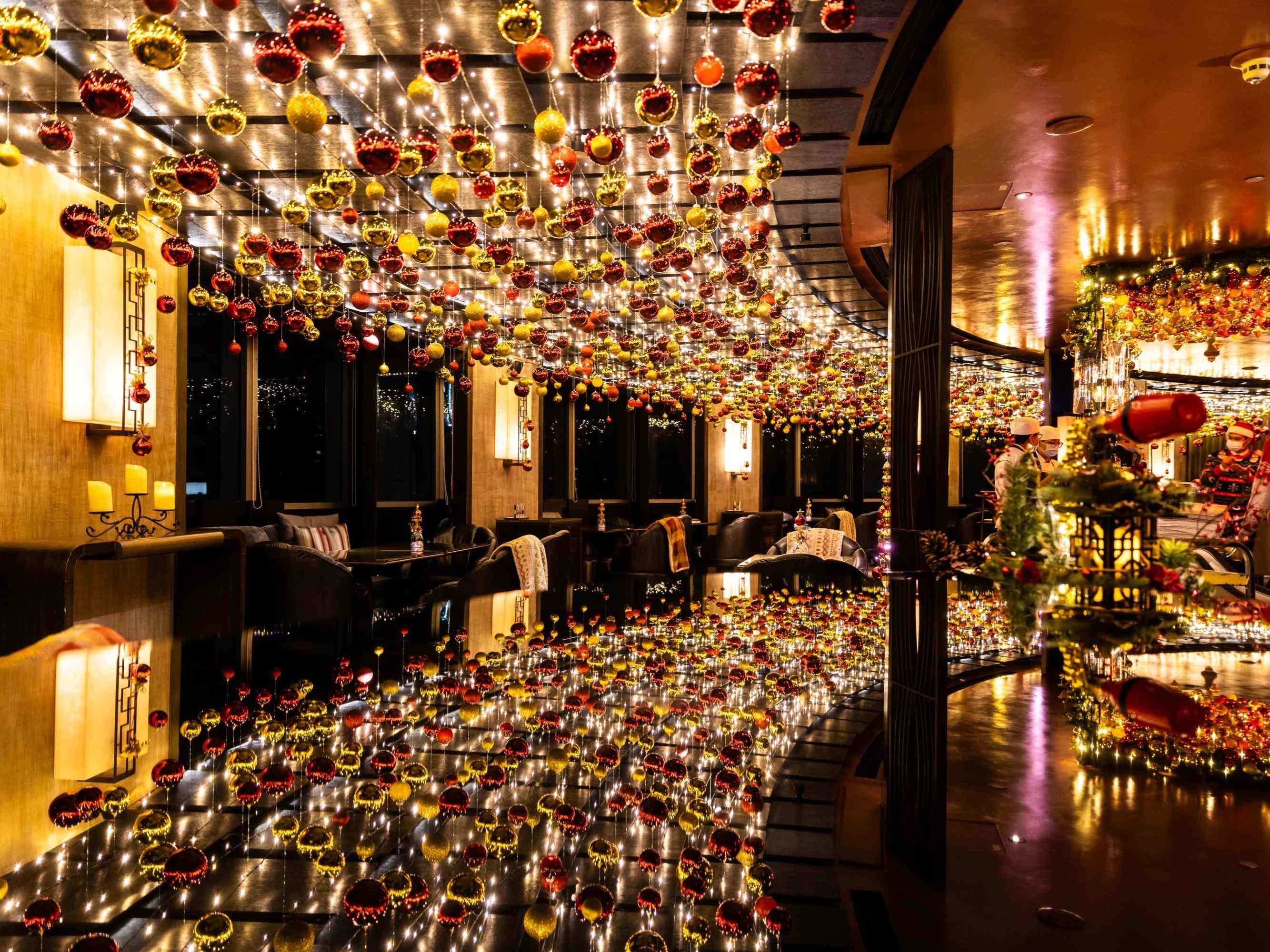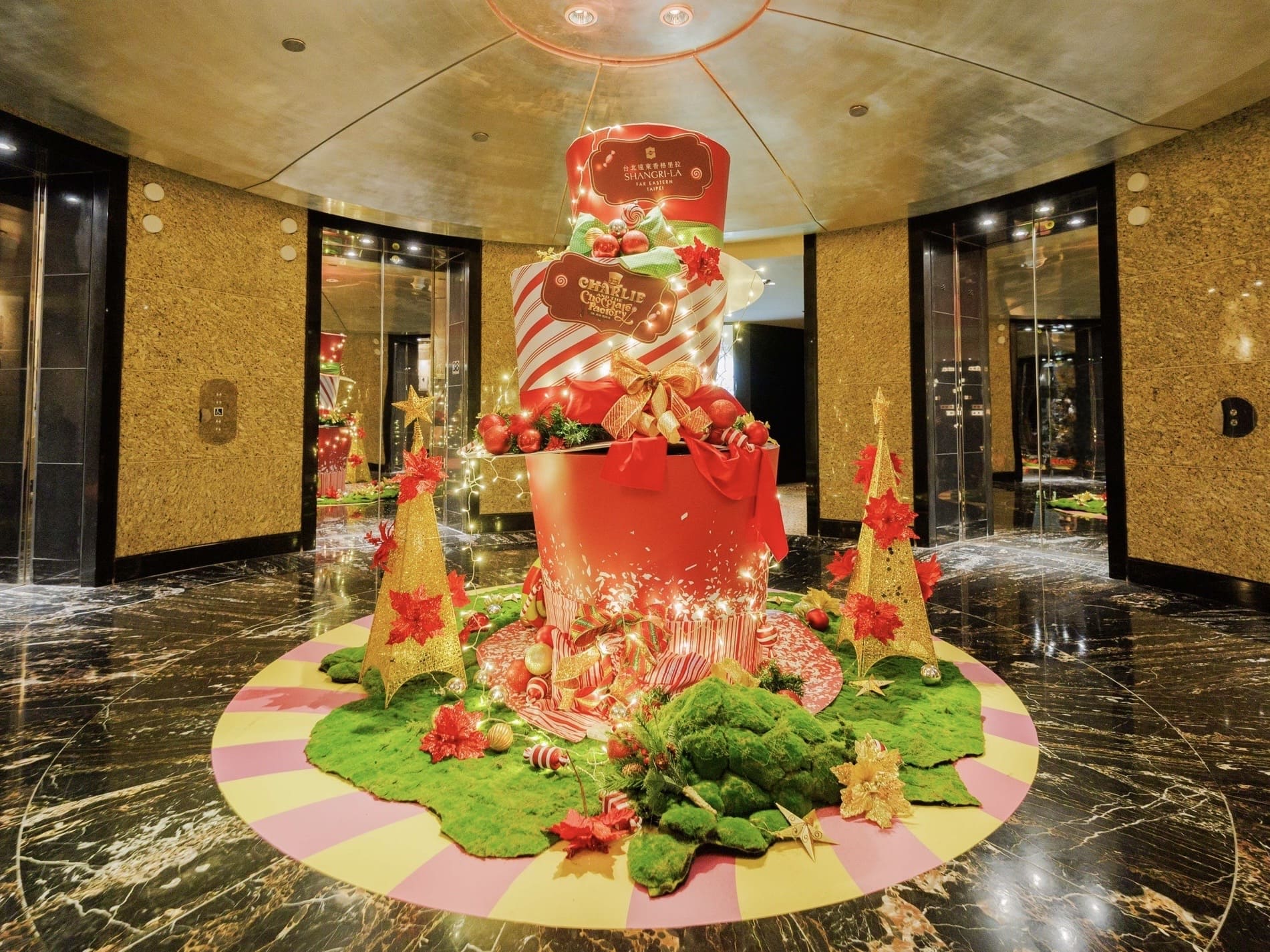 若繼續抵達馬可波羅餐廳及酒廊所在的三十八樓,裝置則轉為神秘優雅,以威利·旺卡 (Willy Wonka)標誌性的「魔術高帽」為核心,創意堆疊出奇幻高度,帽身纏繞著浪漫燈串與聖誕裝飾,彷彿施了魔法般蹦出無數糖果與禮物,營造出時尚氛圍,也襯托高樓層景觀餐廳的活力與浪漫。