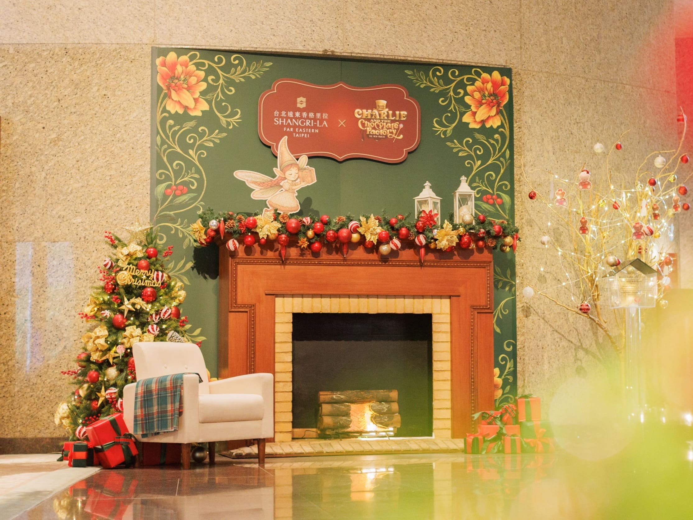大廳一隅打造為充滿英倫風情的壁爐客廳場景,溫暖的柴火光影搭配堆疊的聖誕禮物,營造出溫馨的節慶角落。圖/台北遠東香格里拉提供