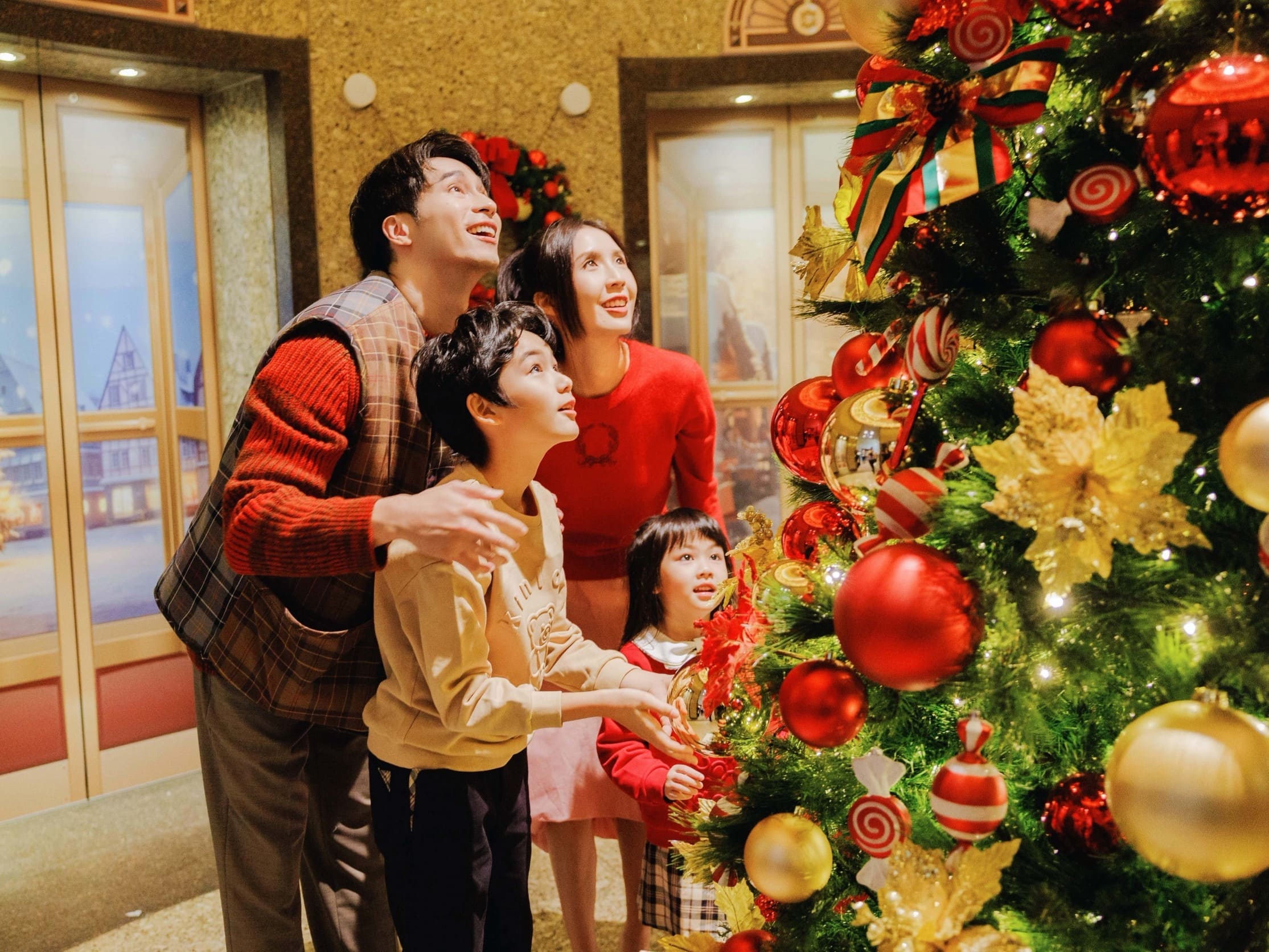 除了兩大場景,環繞大廳的巨型圓柱也換上節慶新裝,呈現「英倫格紋」與「奇幻紅金」雙主題視覺。一款以經典的紅綠蘇格蘭格紋呼應音樂劇的英式復古美學;另一款則以充滿節慶感的紅色為底,飾以精緻的金色花卉圖騰與聖誕樹剪影,兩者交錯排列,將整個大廳長廊串聯成一條華麗優雅的聖誕大道,讓賓客每一步都沉浸在濃厚的佳節氛圍中。