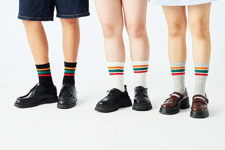 設計延伸7-11的紅橙綠,再加上亮色跳接與小巧刺繡,從日系簡約到青春感十足的風格都能找到對應款。中筒、船型等不同長度,讓通勤穿波鞋、假日踩運動鞋或在家放鬆時,都能選到一雙順眼又好搭的襪子。