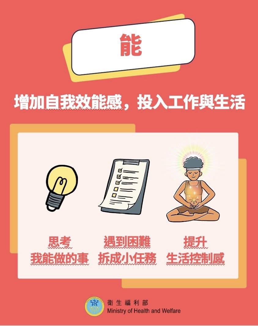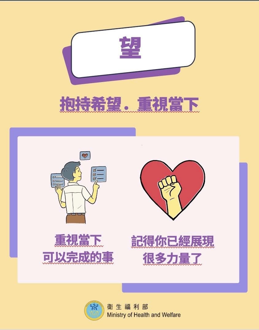 在等待諮商前,自己也能先調適。衛福部推「安靜能繫望」五字訣,簡單好記: