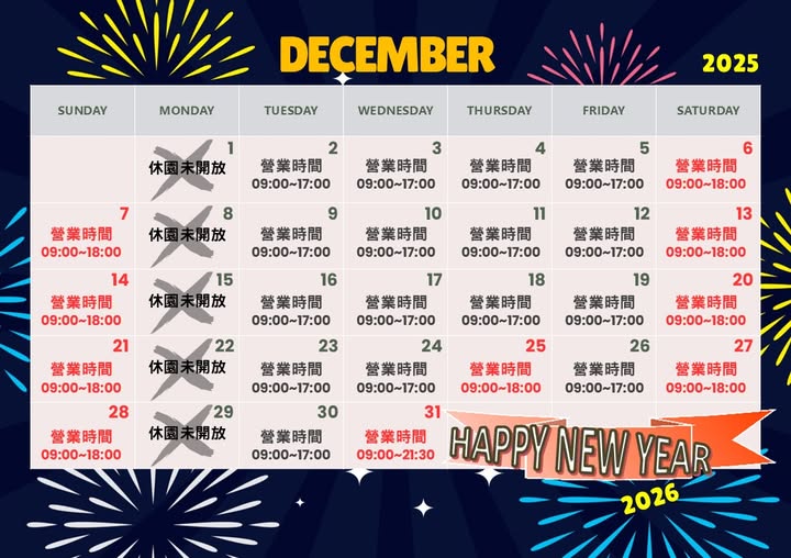 為配合跨年活動,兒童新樂園宣布將營業時間延長至晚間9點30分,讓大人小孩能在煙火表演後仍有充分時間慢慢離場,也能繼續遊玩園區內設施不必匆忙離開。園區同時推出**「跨年一日券」**,持票可於指定時段暢玩大型遊樂設施,像是摩天輪、旋轉木馬、星空飛行等都是孩子的最愛。