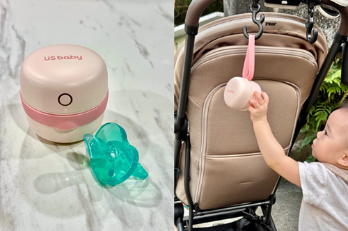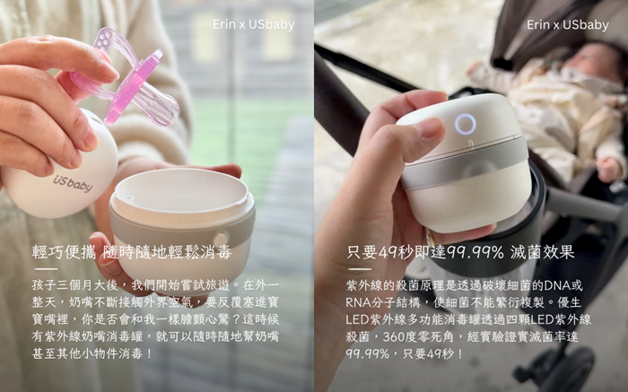 #Erin:「往常小饅頭的奶嘴都是吃了一天、在晚上睡著後才放進消毒鍋裡。但在外旅遊時,奶嘴不斷接觸外界空氣、要反覆塞進寶寶嘴裡前都很心驚!還好有US baby紫外線消毒罐,可以隨時隨地幫奶嘴甚至其他小物件做消毒!」