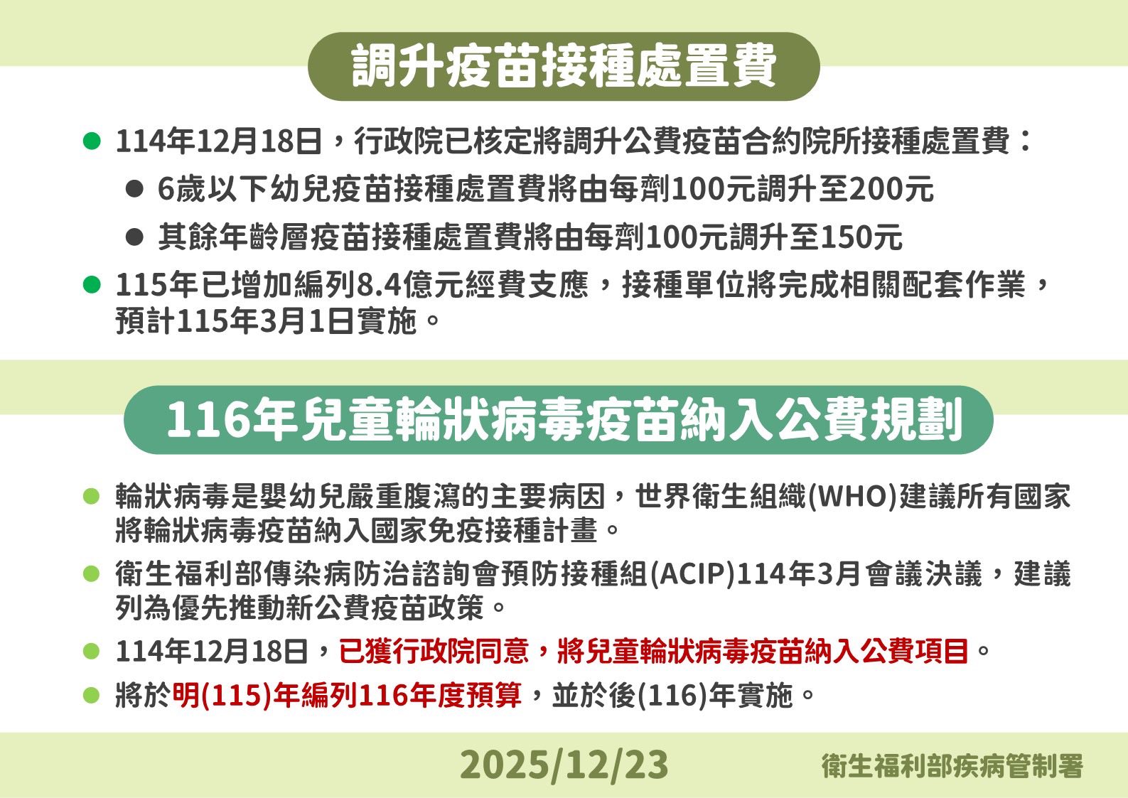 除了既有三大新措施,政府也預先規劃將於116年起,正式把「輪狀病毒疫苗」納入兒童公費疫苗計畫。根據世界衛生組織(WHO)建議,輪狀病毒疫苗應列入各國例行性免疫行程,因輪狀病毒是全球嬰幼兒嚴重腹瀉與脫水的主要原因。