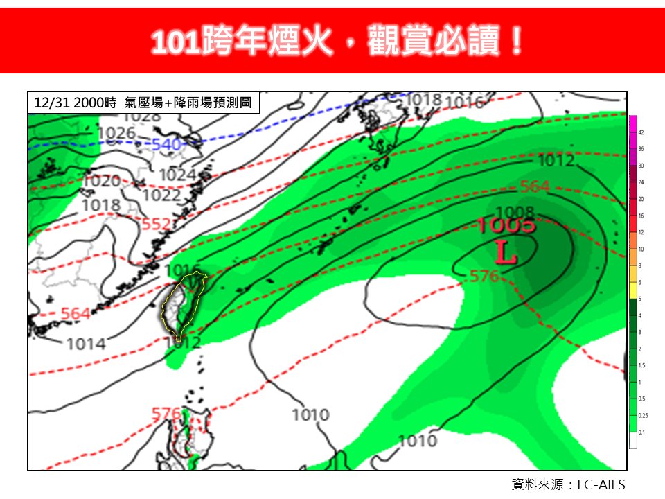 氣象達人林得恩博士在粉專「林老師氣象站」分析指出,今年跨年夜(12月31日至元旦凌晨)台北地區受東北季風南下影響,氣候濕涼,氣溫約15至18度,出現多雲短暫雨的機率偏高。若風向為東北至偏東風,煙霧會朝西南方向飄移,因此「101的東側與南側」不僅煙霧少、畫面乾淨,對親子家庭而言也方便活動與撤退。