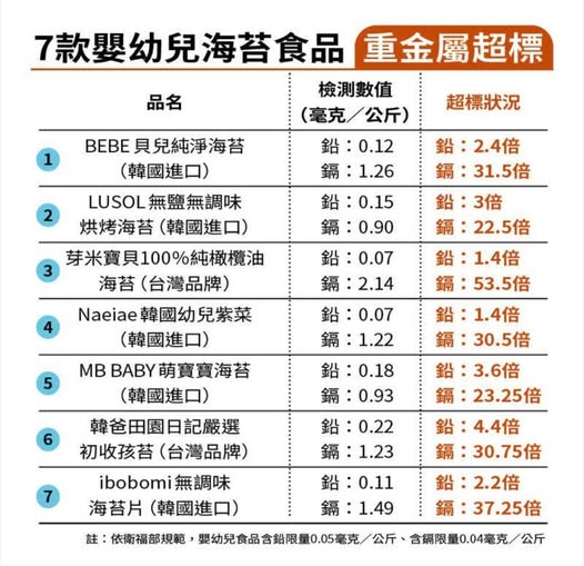 行政院消保處日前針對市售嬰幼兒食品進行稽查,結果驗出台、日、韓等4款重金屬超標產品並已全數下架。不料,《鏡週刊》進一步跟進調查,發現問題比想像更嚴重,7款含韓國海苔成分的嬰幼兒食品再度送驗,居然全部超標,其中一款的「鎘」含量甚至飆破法規標準50倍!