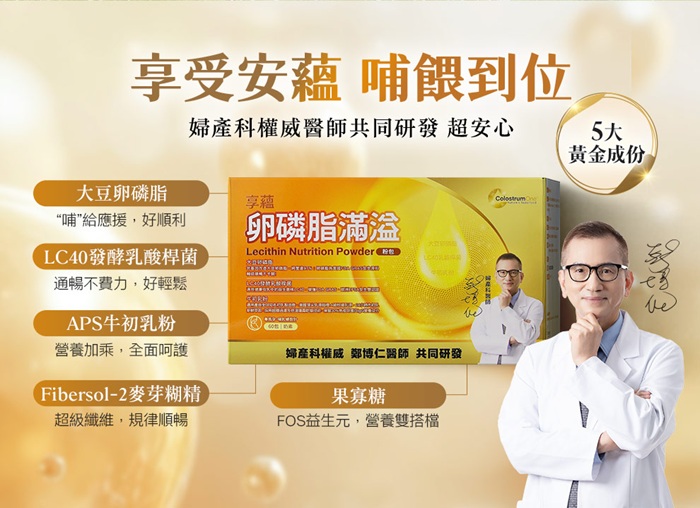 「享蘊卵磷脂滿溢粉包」每包皆蘊含高達2500mg 的97%高純度非基改大豆卵磷脂,並擁有美國 FDA GRAS 與歐洲 EFSA安全雙認證,確保品質無虞。在配方研發上,更是全台獨家添加了LC40 發酵乳酸桿菌,並結合擁有6,000多篇科學研究支持的美國APS A級牛初乳粉,全方位守護媽咪的生理機能!此外,搭配超級纖維麥芽糊精與果寡糖益生元,從維持消化道機能出發,由內而外為媽咪打造優質好體質。