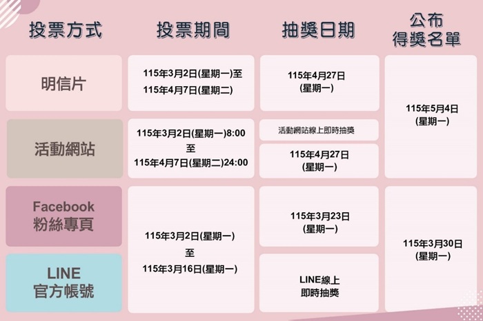 記得大人小孩一起投票喔!「115年郵票選美」活動網站:https://lottery.post.gov.tw/post/internet/post_vote115/index.jsp