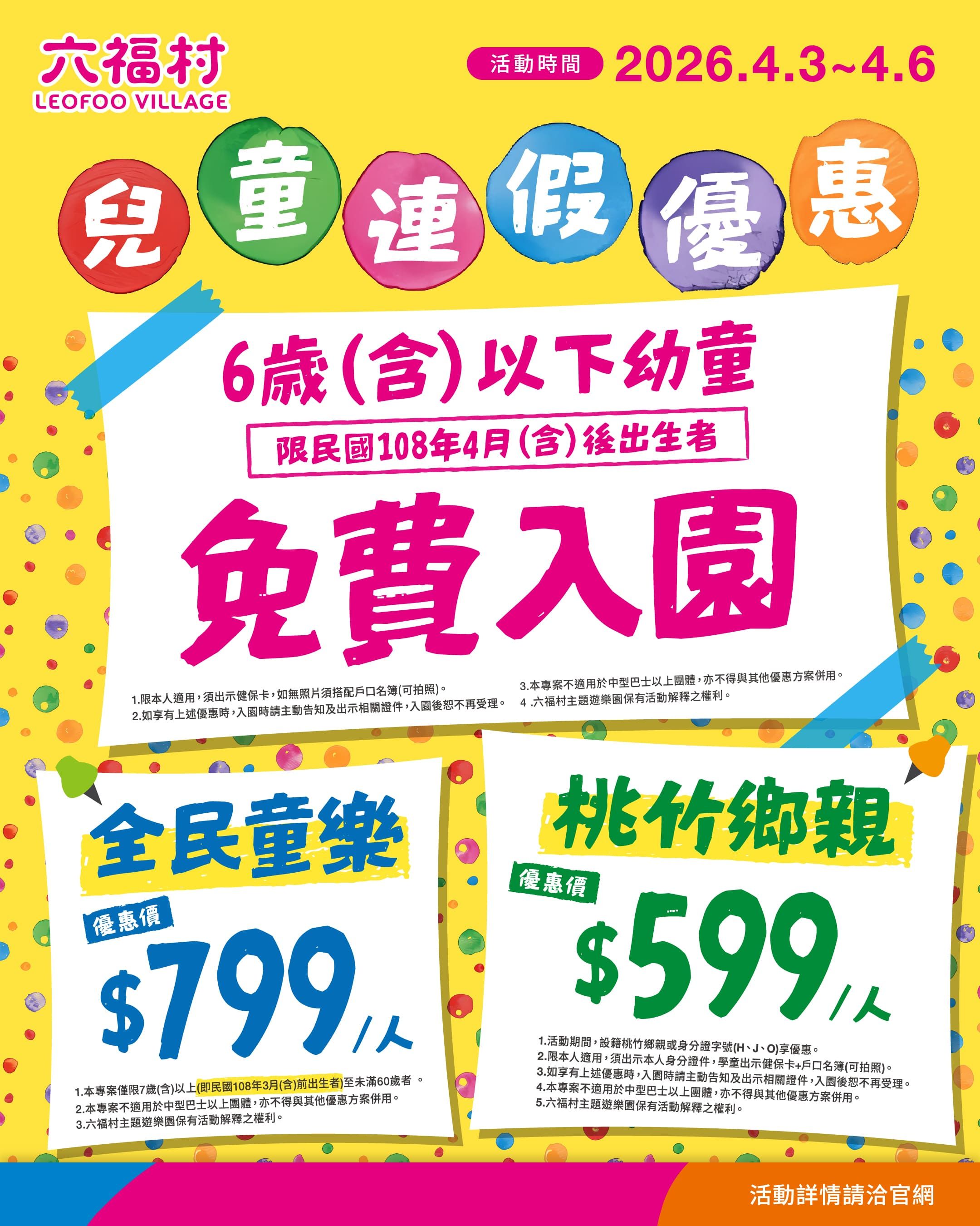 本次優惠內容包括:6歲(含)以下幼童免費入園,限民國108年4月(含)後出生者;全民童樂價799元,限7歲(含)以上至未滿60歲者;桃竹鄉親優惠價599元,凡設籍桃園、新竹地區民眾,或身分證字號英文字首為H、J、O者皆可適用。詳細活動辦法與證件規範,依六福村主題遊樂園官方公告為準。