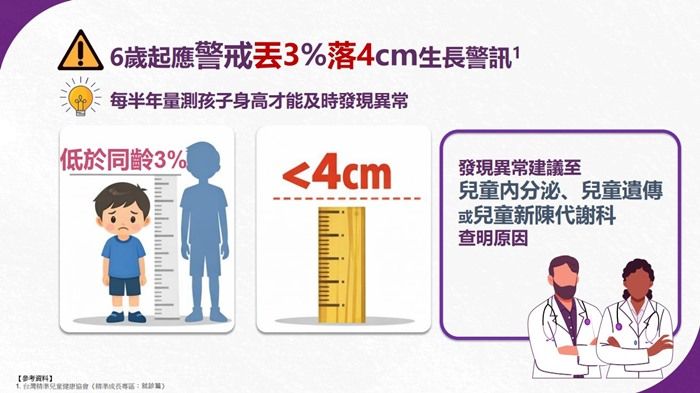 .自孩子6歲起,若發現身高落在同齡第3百分位以下,或一年內長不滿4公分,皆屬「成長丟三落四」警訊,建議應及早至小兒遺傳、內分泌或新陳代謝等專科進行評估。
