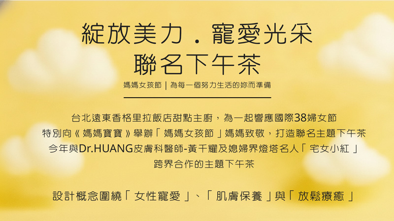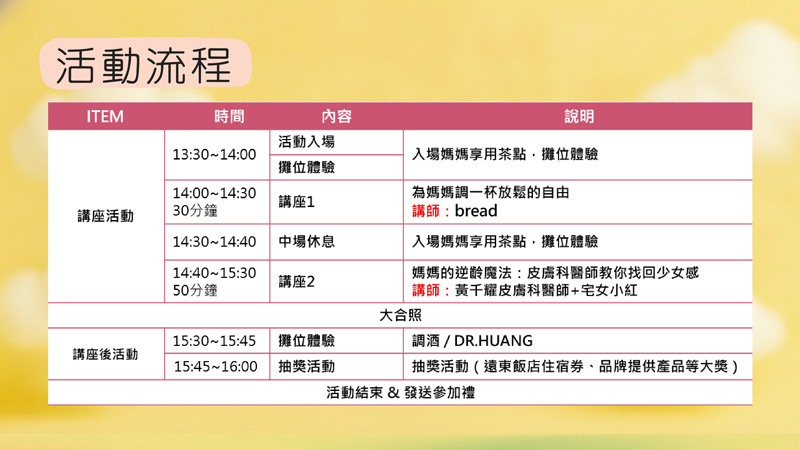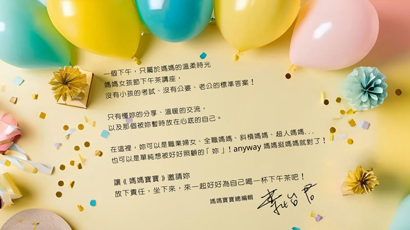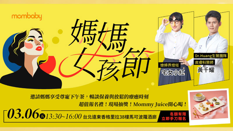 內容說明 完整內容 注意事項 *因場地空間有限及讓媽媽們好好放鬆享受ME TIME時刻,婉謝帶小孩或另一半出席哦 *活動報名限一人出席參加,請勿攜伴 *報名以匯款完成為主(匯款完成才視為成功報名) *活動當日若無法出席,僅會補提供參加禮(活動後一周內郵寄),恕無法報名費退款。 完整內容 主辦單位 名稱:Dr.HUANG 電話:02-82520408 網址:https://www.edrhuang.com.tw/ 名稱:媽媽寶寶 電話:(02)2505-8989 網址:https://www.mombaby.com.tw/